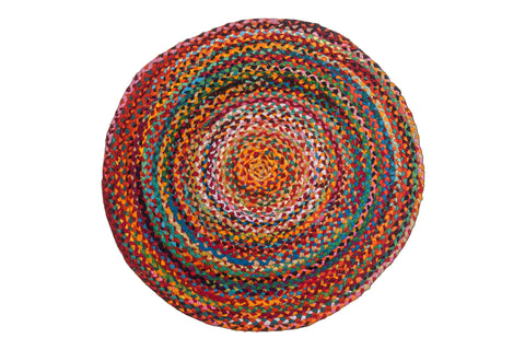The Jute Chindi Round Rug is where rustic tradition meets vibrant innovation. Handcrafted by skilled artisans, this rug is a beautiful fusion of natural jute fibers and colorful recycled cotton fabric stripsâ€â€Âknown as "chindi." Each piece tells a story of sustainability, heritage, and artistic expression. The earthy tones of jute are brought to life with the playful vibrancy of fabric remnants, making every rug a unique celebration of resourcefulness and design.