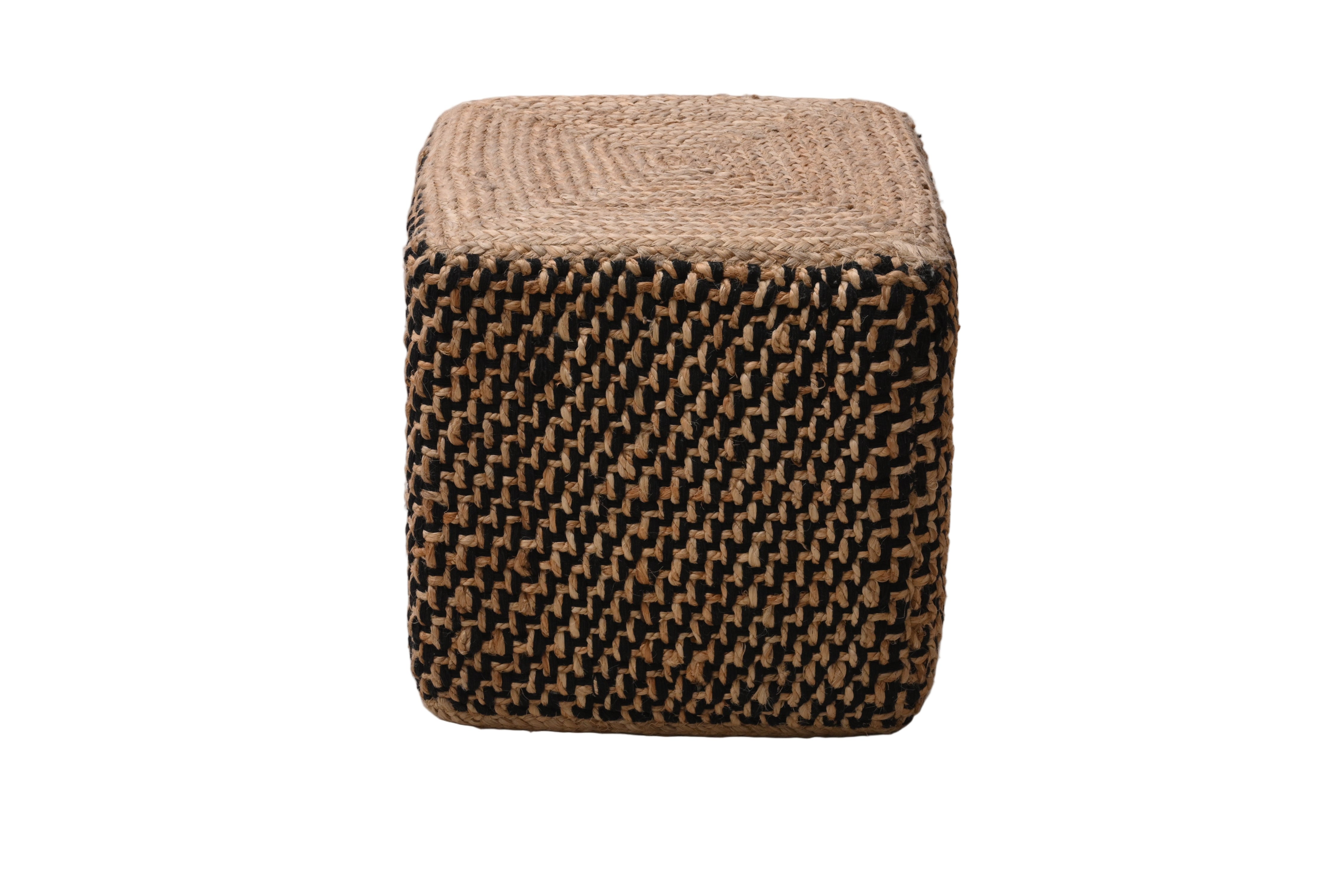 Puff Cuadrado de Yute Natural y Negro Tejido a Mano