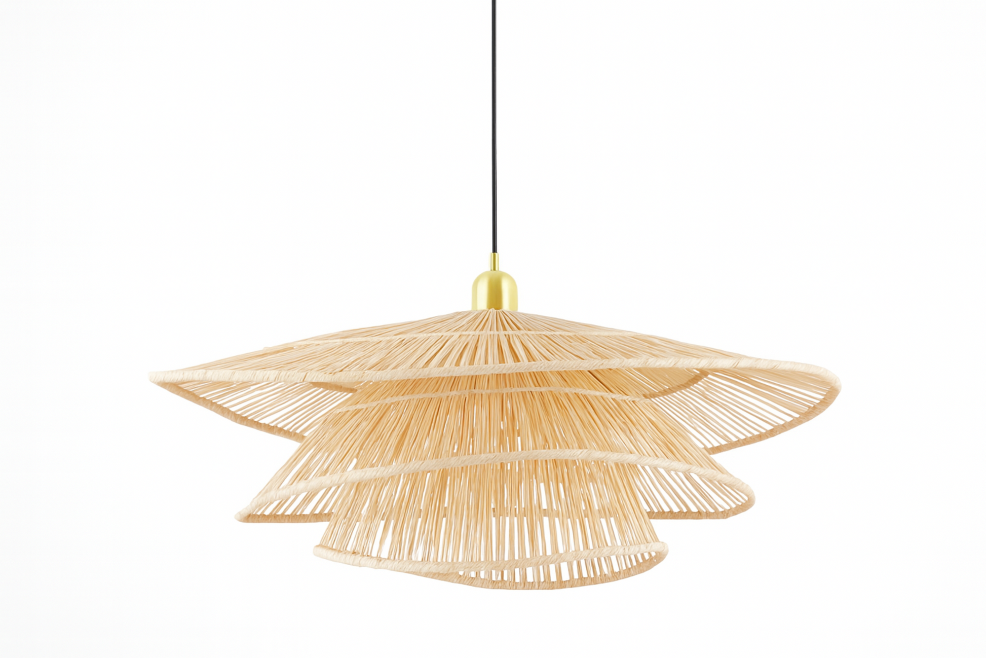 La Lámpara Colgante de Ratán en Capas es una pieza de techo llamativa que aporta textura y elegancia orgánica a tus espacios. Su diseño en niveles, similar a una sombrilla, proyecta una luz cálida y difusa que crea un ambiente acogedor y artístico.