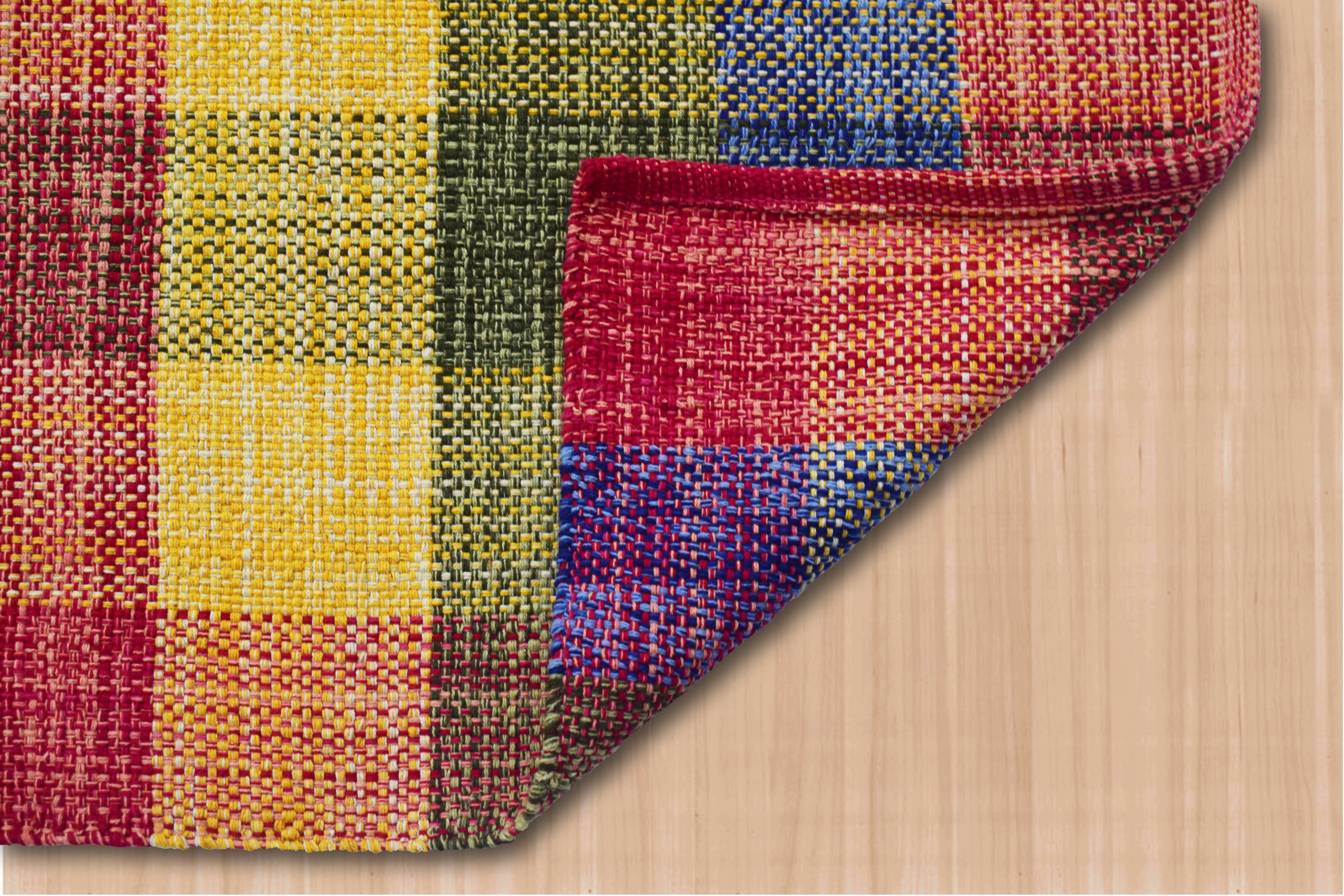 Cada pieza está cuidadosamente tejida a mano con tiras de algodón multicolor, formando un patrón de cuadros que aporta estructura, ritmo y energía visual a cualquier ambiente. La fusión entre color, artesanía y textura cuenta una historia que va más allá de la estética: transmite calidez, cultura y encanto artesanal al hogar.