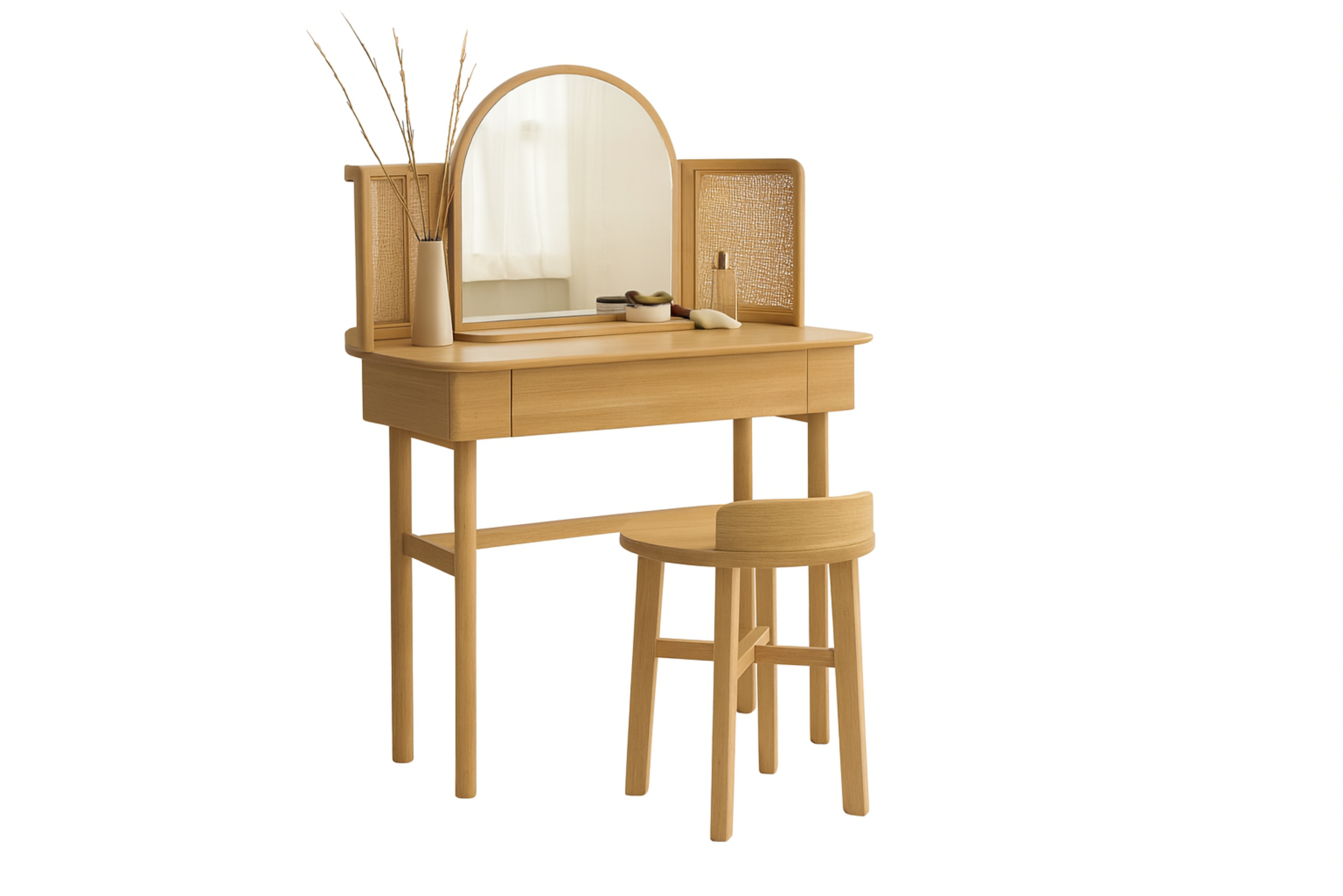 La simplicidad refinada se encuentra con el encanto natural en este set de tocador artesanal. Diseñado en una fusión escandinava-bohemia, la pieza incluye un espejo arqueado integrado, compartimentos de almacenamiento con elegantes puertas de ratán y un taburete de madera compacto. Este set multifuncional es perfecto para organizar tus esenciales diarios en un dormitorio acogedor o en un rincón de vestidor. Los tonos cálidos de la madera y los materiales orgánicos aportan luz y calidez a cualquier espacio, sin dejar de ofrecer estilo y funcionalidad.